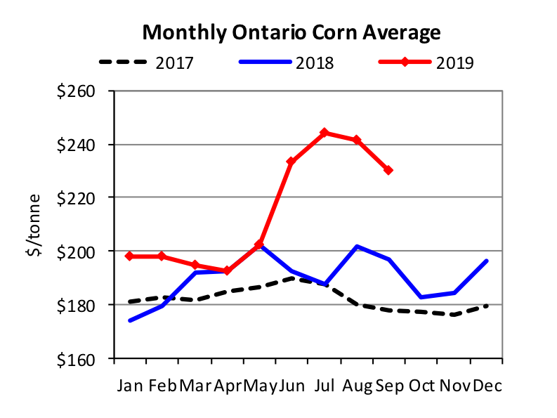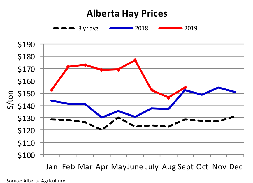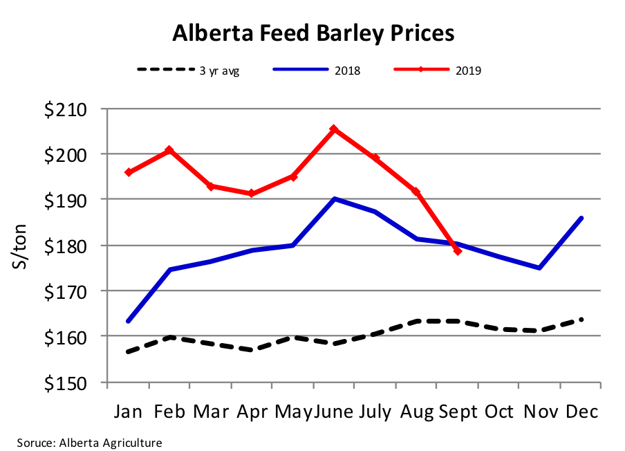 Fall has arrived and focus has shifted to winter feed supplies. Feed prices have dropped significantly from their June highs, but unfavorable weather conditions have left the question of available supplies. Hay prices vary significantly with prices in some areas with short supplies nearly double those in areas with adequate supplies. On the other hand, there could be numerous options for alternate winter feeds this year as some crops originally intended for grain are being harvested as livestock feed. Harvest delays and the likelihood of frost damage has led to quality downgrades. Alberta feed barley prices have dropped 13% from the June peak at $205/ton to $179/ton in September, and market analysts project that the feed grain markets have not hit bottom yet.