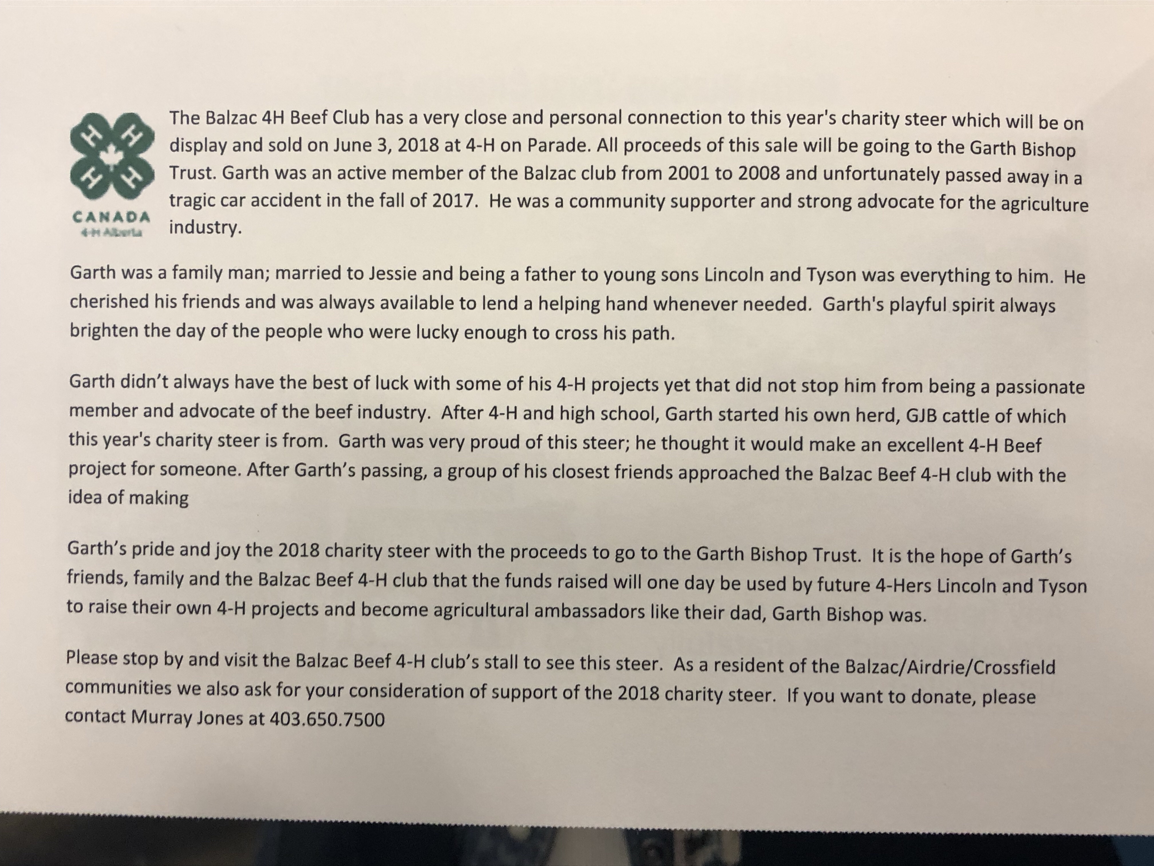 In the Fall of 2017, the community of Balzac lost a dedicated community member in Garth Bishop. In the wake of the tragedy, Stanley Jones and the Balzac Beef club decided to raise this year’s 4-H on Parade charity steer and will be donating the money raised from the steer’s sale to his young family. Bishop was an alumnist of the Balzac Beef Club. The steer will be auctioned off around 12 p.m. on Sunday, June 3, 2018.